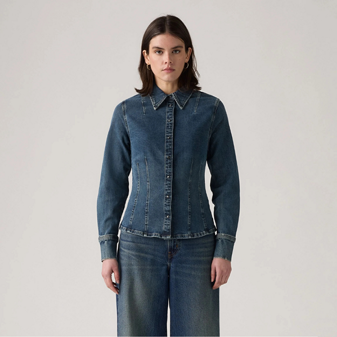 Klasik denim gömlek, biraz daha form kazandı. Long-Sleeve Shaped Gömlek; düğmeli ön tasarımı, dikiş detayları ve vücudu saran slim fit kesimiyle feminen ve modern bir siluet sunar.