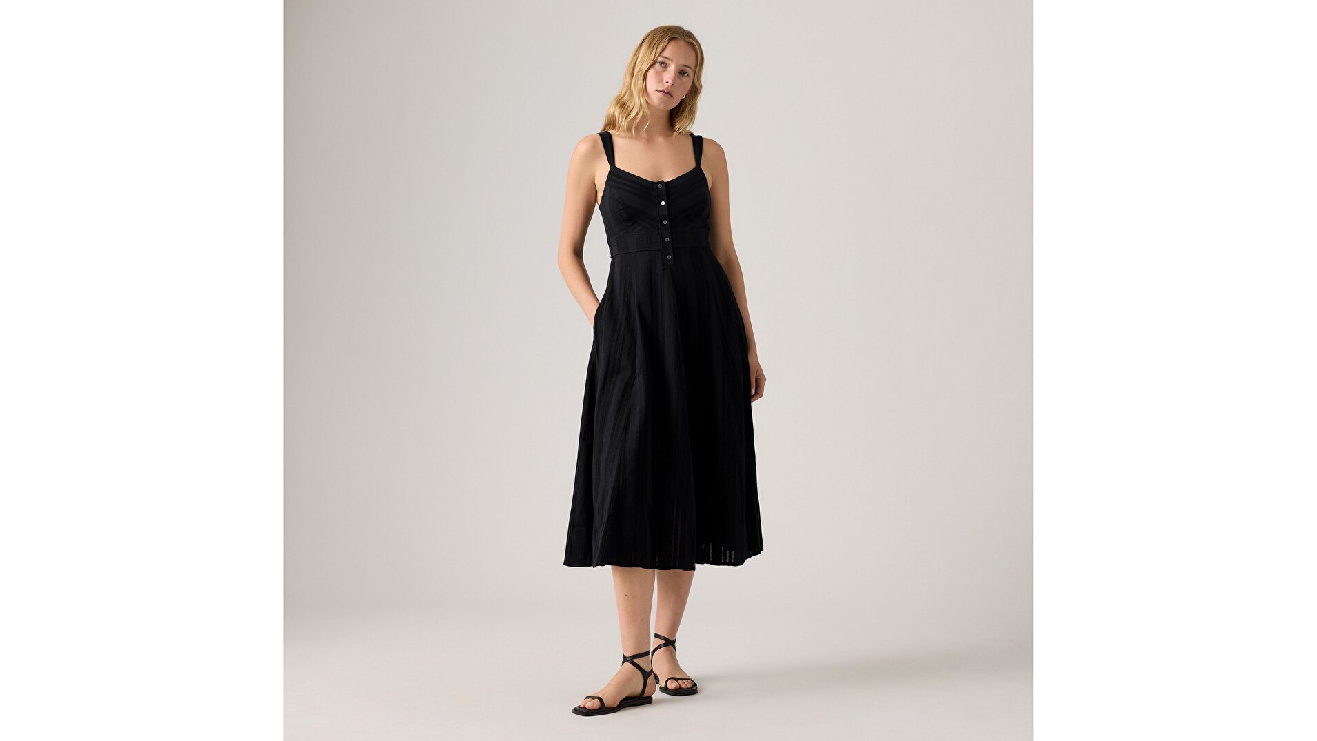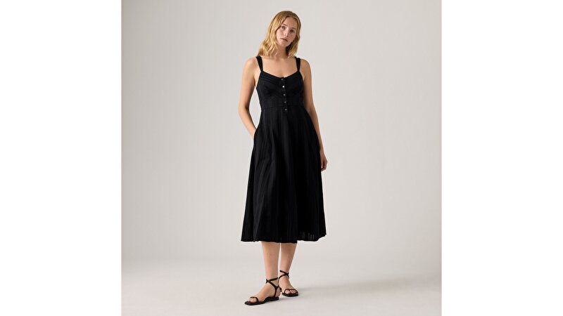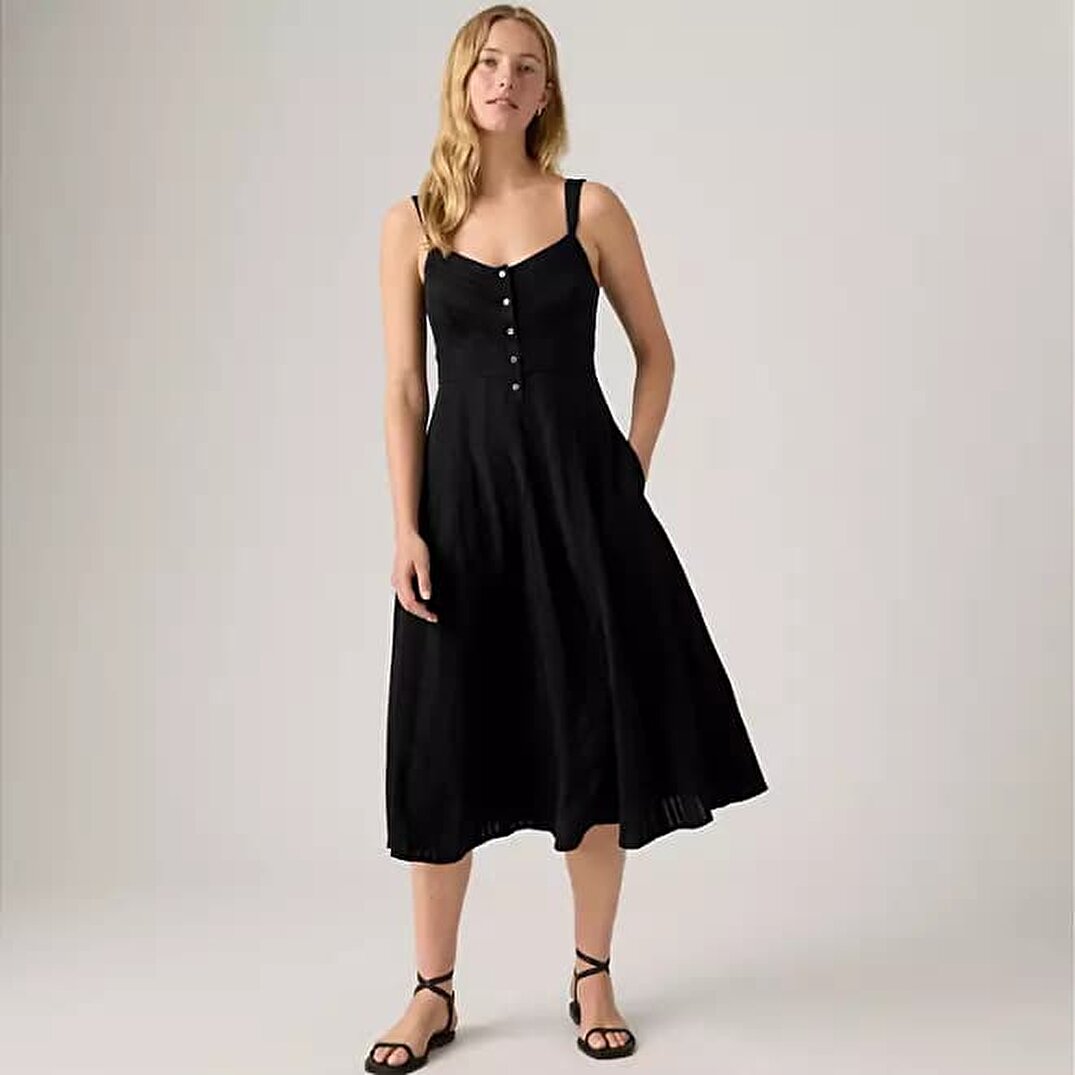--Ravina Midi Elbise--, ister günlük ister şık stillerle kombinleyebileceğin çok yönlü bir parça. Sütyenle uyumlu askıları, düğmeli önü ve zarif A-kesim siluetiyle gün boyu şıklık ve konfor sunar.
