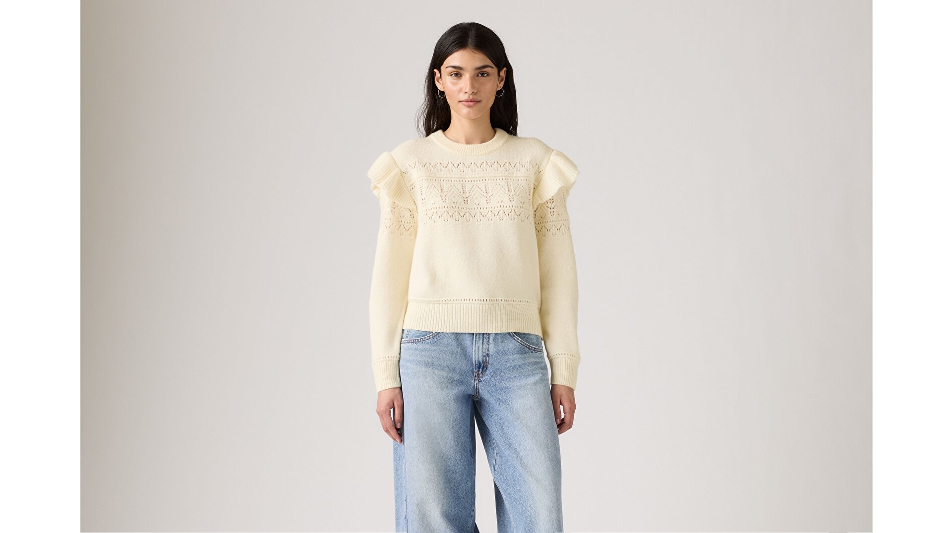 Günlük kazak stilinize hareket katın: Shane Flutter Sleeve Sweater, rahat ve standart kesimiyle kollarında nakış detayları ve fırfırlar sunuyor.