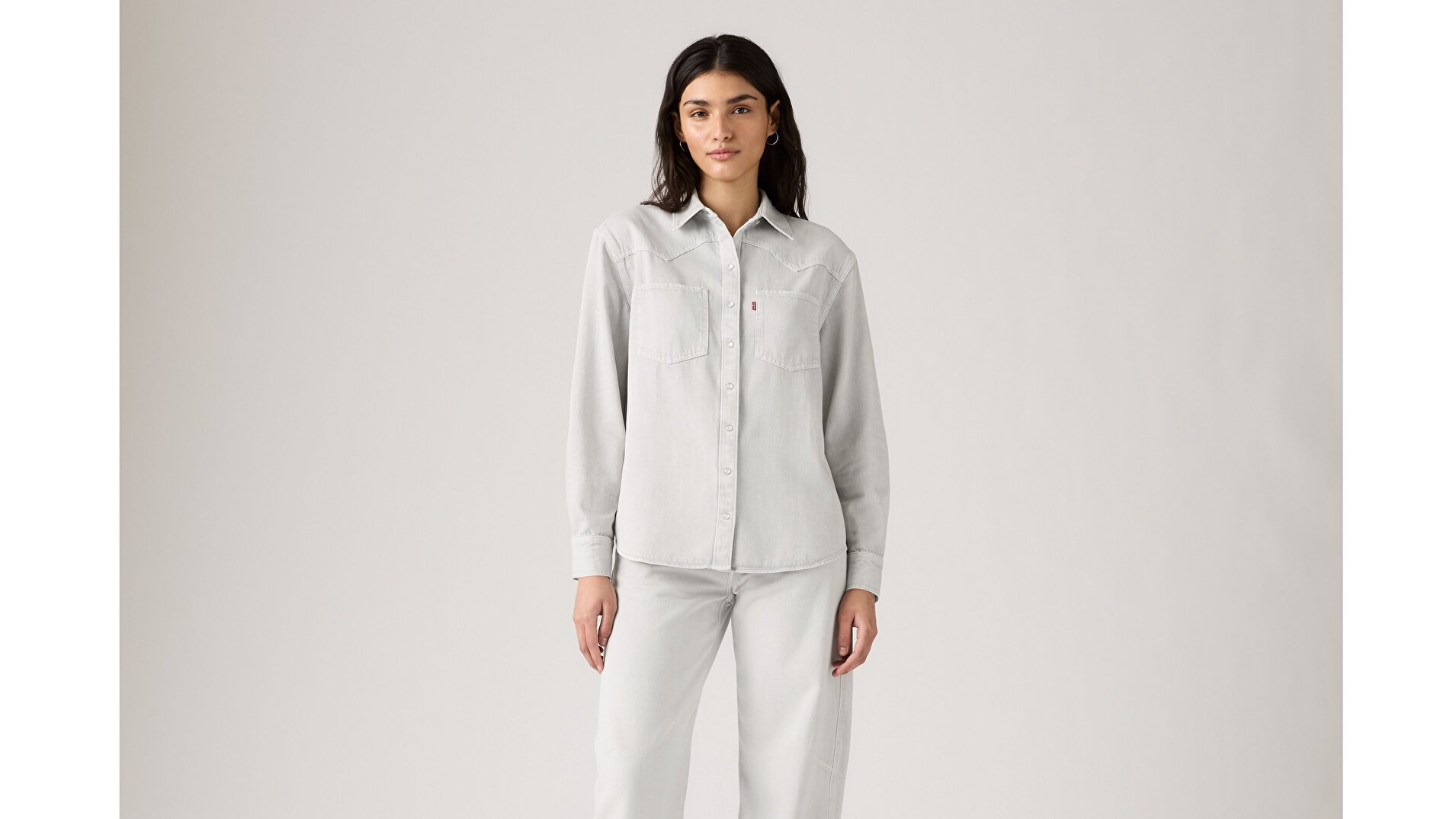 Cowboy çizmeleri dahil değil. Teodora Western Gömleğimiz, klasik bir western parçasına kadınsı bir dokunuş katıyor. Bu gömlek, klasik çıtçıtlı ön kapanışa, iki yamalı cebe, rahat bir kesime ve western esintili bir yaka tasarımına sahiptir. Lightweight Denim kumaştan üretilmiştir.