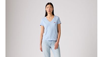 Modern V yaka, süper yumuşak jarse ve göğüste zarif bir logo ile bu çok yönlü temel, günlük tişörtünüz için mükemmel bir alternatiftir. En sevdiğiniz jean pantolonlarınızla kombinleyeceğiniz temel bir V yaka.